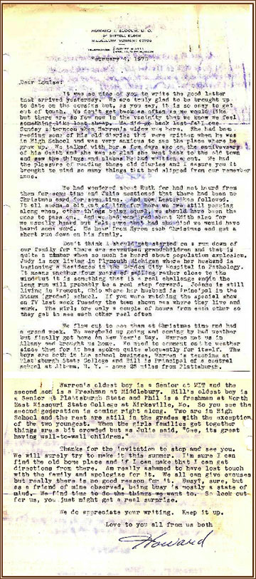 Aunt Louise then announced that Ted and Marge Dineen (Marge was a cousin, the daughter of John and Edith Whittemore) had been invited to the clam bake, and had declined in a letter to Aunt Florence. She also announced that Aunt Edith (John Whittemore’s wife) would be 90 on July 30. It was also reported that Donald and Lois Hamilton (Lois Whittemore Hamilton was the daughter of Minnie’s brother Ed) and Marion Rogers (Marion McKernon Rogers was the daughter of Minnie’s sister Jennie) had been invited and had had to decline. There was some question as to the status of Merrill and Marcia (Merrill Whittemore was Lois Hamilton’s brother and Marcia is his daughter). Aunt Louise then read a letter from Howard Slocum.